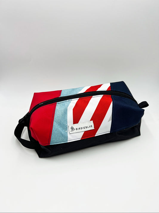 Featuring our fan-favorite Carry All and Traveler silhouettes, every piece is made in classic red, white, and blue—and no two bags are ever the same. The graphics, colors, and markings from the original banners make each bag a true original and a small piece of ski history.